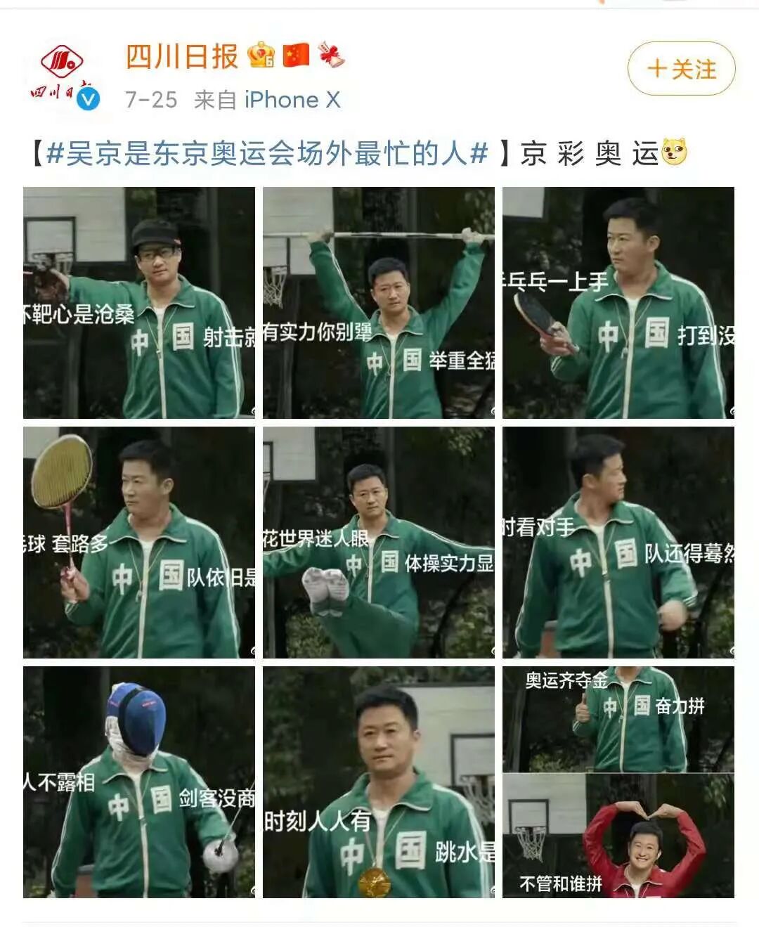 四川官方媒体四川日报也来凑热闹了,在微博上发了吴京做各种运动项目的搞笑表情包,并取名《京彩奥运》