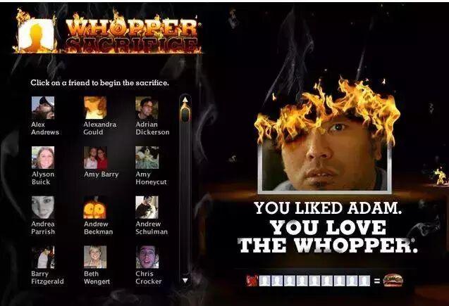 汉堡王还擅于“坑粉丝”,汉堡王曾在facebook上推出过“互相伤害”的社交营销:只要删除10位好友,并自动发送信息,“我为了一个免费汉堡把你从好友名单中删除了!”,就可以获得一份套餐。