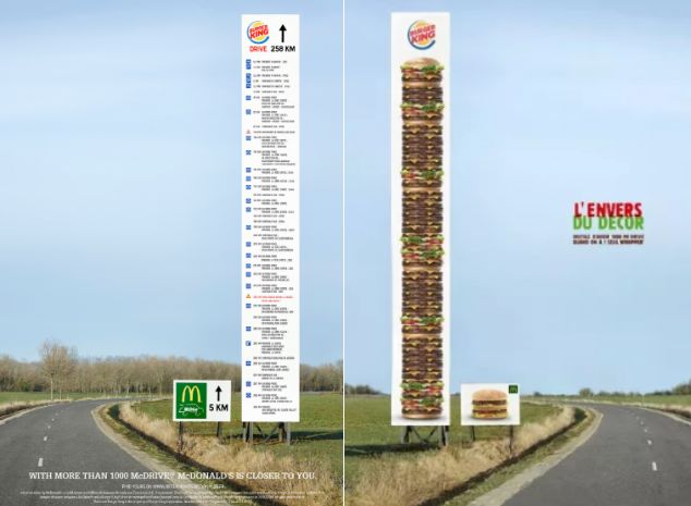 在法国一个小镇的路标上做了俩广告牌:左边是麦当劳,右边是汉堡王,由图可知,去一趟汉堡王的行车路线拉满整个广告牌,而麦当劳却只需要5km,表达的就是我麦当劳哪都有店,而你汉堡王店又少又不好找!