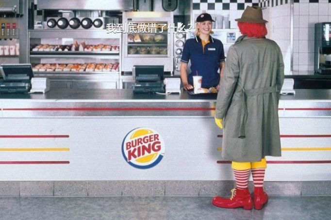 90年代,汉堡王设计了这个麦当劳叔叔乔装打扮来买汉堡王whopper的广告,直白地挑衅“It just tastes better." (怎么办,皇堡就是比巨无霸好吃啊。)