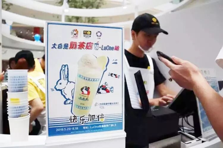 大白兔奶茶店由「大白兔」和「快乐柠檬」联名推出,坐落在上海LuOne凯德晶萃广场L3层,在5月29日到8月18日期间营业。