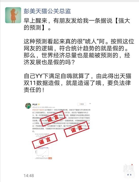 “根据网友的逻辑,符合统计趋势的就是造假,那么,世界经济总量也是能被预测的,经济发展也是假的吗?自己YY下满足自嗨就算了,由此得出天猫双十一数据造假,是造谣要负法律责任的。”