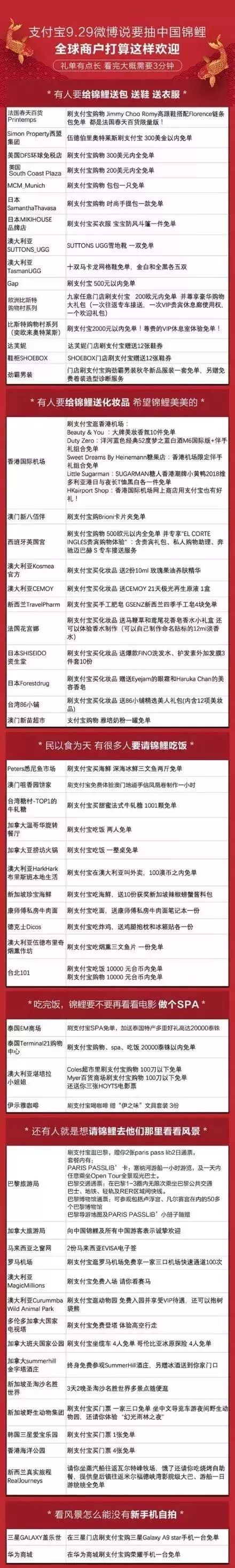 然后,我们看看参与这次活动的都是世界级品牌,主要是支付宝搭建了一个大戏台,邀请将近200多家支付宝全球合作伙伴一起狂欢,一起来曝光,共同构筑出这次完整的「中国锦鲤」活动。值得注意的是,这是双赢的合作,看似品牌们是提供奖品,是属于付出的一方。实际上品牌们能参与这次盛大的狂欢,就相当于“抱团致胜”。单独一个LV的奖品很难激起网友们热议,而价值上亿的品牌云集就很难让人不动心了,只要网友关注度高,自家品牌就能随之曝光,最关键还能和支付宝及其他世界级品牌合作赢取声量,如果是会玩的品牌岂能错过这次大好机会?