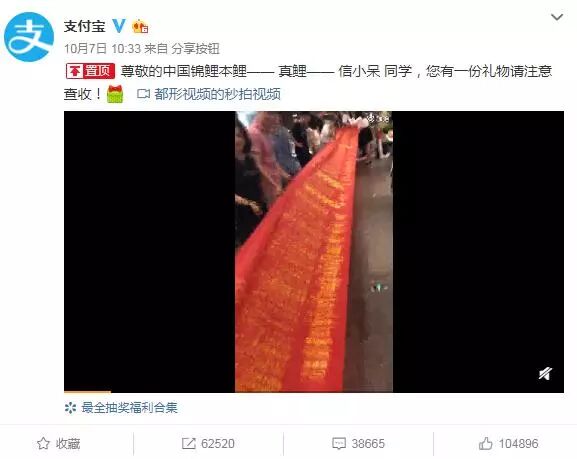 9月29日下午14点整,支付宝发布一条【祝你成为中国锦鲤】的微博,@所有微博网友参与互动转发,然后将在10月7日抽出一位集全球独宠于一身的中国锦鲤,这个幸运儿将拿奖拿到手软。