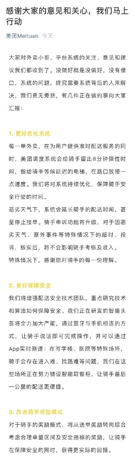 9月9日晚间,美团外卖发布声明,表示将更好优化系统,在为用户提供准时配送服务的同时,调度系统会给骑手留出8分钟弹性时间;同时改进骑手奖励模式,让骑手在保障安全的同时获得更实际的回报。