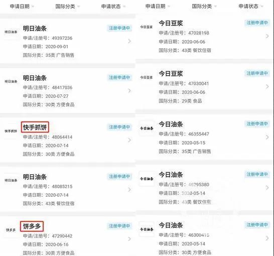令人惊讶的是,“今日油条”不仅蹭上了今日头条的热度,还打算蹭拼多多,快手等各大知名品牌的热度。据公开资料显示,河南今日油条餐饮管理有限公司,目前已申请注册“今日油条”、“明日油条”、“饼多多”、“快手抓饼”等商标,看来,“今日油条”决心要把“山寨”进行到底。