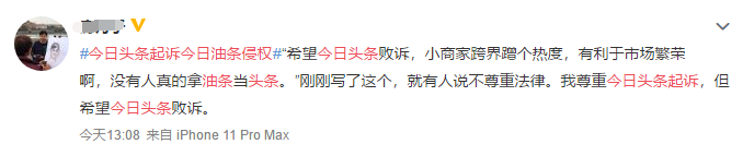 今日油条“碰瓷”今日头条,到底只是觉得好玩,还是为了蹭热度引发关注,我们不得而知,不同的人对该行为的解读可能也不一样,但不管官司输赢,今日油条都已经赢了。