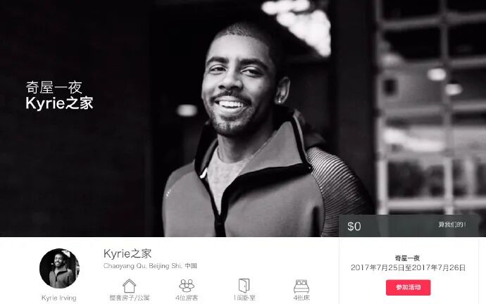 2017年7月,爱彼迎宣布与耐克合作,在北京打造“Kyrie”之家。每一个喜欢篮球的人都可以来这里跟美国篮球巨星凯里·欧文切磋球技。而欧文也化身房东,热情招待每一位房客。