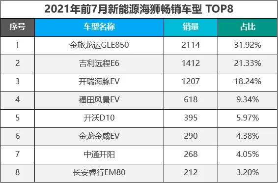 海狮领域,有三辆车型销量破千。排在首位的金旅龙运GLE850占据了前7月海狮市场约32%的份额;吉利远程E6市占比为21.33%,销量为1412辆;开瑞海豚EV销量为1207辆,成为季军,销量占比为18.24%。