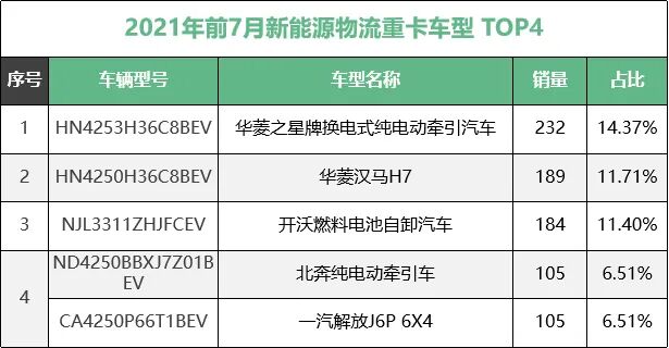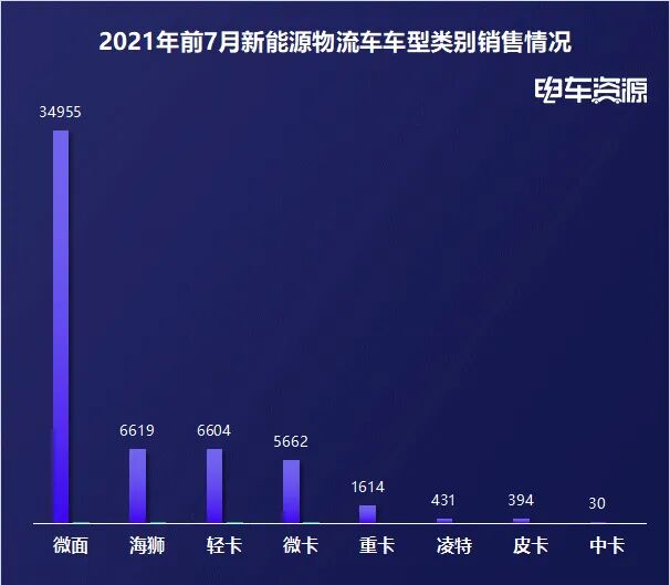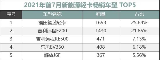 仅从车型来看,2021年前7月新能源物流车的销售情况具体如下: