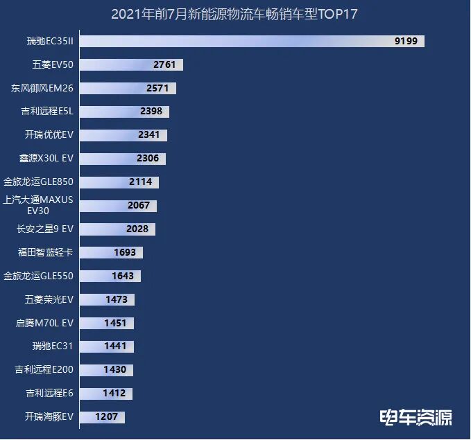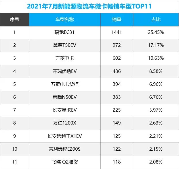2021年前7月新能源物流车畅销车型TOP17榜单