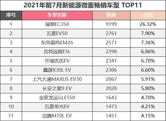 瑞驰EC35II的销量为9199辆,占前7月微面市场26.32%的份额,排在首位。而排行第二位的五菱EV50销量仅有2761辆,占比7.9%。第三名东风御风EM26也只有2571辆的销量,占比为7.36%。