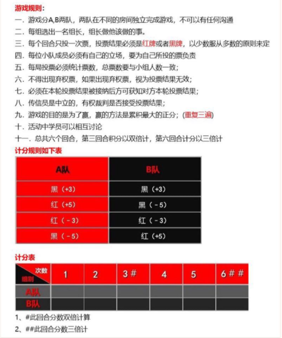 第二阶段有个环节让殇小辛印象深刻。那是一个叫做“红与黑”的游戏,大家分成两队,每队用内部投票的方式决定出红牌还是黑牌,两队都出红牌,则各减3分;都出黑牌,各加3分;一黑一红,则红方得5分,黑方扣5分。两队之间不允许交流。
