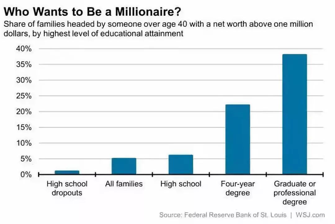 美联储St.Louis 分部的统计数据,说明了家庭中受教育程度最高者(需大于40岁)的受教育程度与家庭净财富超过100万美元的比例的关系。可见绝对财富的级差比收入级差触目惊心多了。硕士学历以上家庭比高中学历家庭的百万富翁比例高30倍!