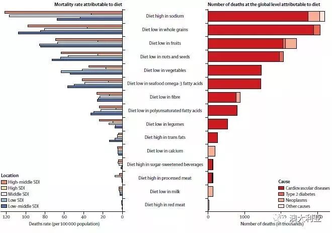 这次的统计给出了一个与我们日常刻板印象完全不同的颠覆性结果,全球范围内每年造成上千万人死亡的错误饮食习惯并不是糖和油脂吃太多,而在于钠、杂粮和水果——