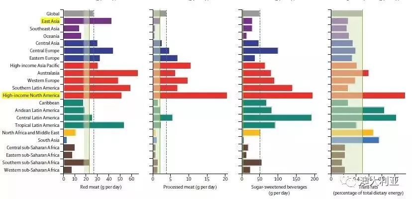 从左到右四张表,分别统计的是红肉、加工肉类、含糖饮料、反式脂肪的平均每日摄入量,除了红肉中国数据较高外,其他三项中国都比日韩为主的高收入亚太地区数据低。