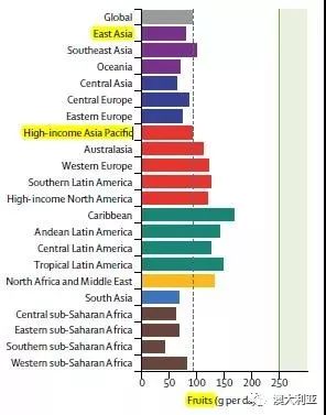 在每日水果摄入量方面,东亚数据依然疲软,没达到及格线(虚线推荐的每天100克),更别说最佳推荐量250克了。不过全世界各地区都没达到最佳推荐量。