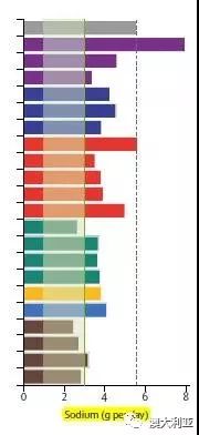最顶上的灰色条代表全球平均水平,第二个紫色条是东亚的数据,基本上可以看做中国的数据。虚线代表底线,绿色线和区间是最佳推荐区间。高钠饮食作为杀手榜上第一把交椅,导致中国连续在死亡率上被cue,似乎也不奇怪了。