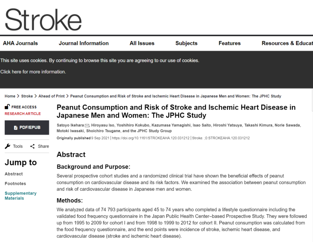 ①Satoyo Ikehara, et al.,(2021). Peanut Consumption and Risk of Stroke and Ischemic Heart Disease in Japanese Men and Women:The JPHC Study. Stroke, DOI: 10.1161/STROKEAHA.120.031212.