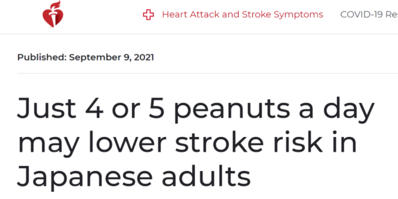 2021年9月9日,一项发表在《Stroke》(卒中)杂志的研究论文就指出,吃点花生(平均每天 4-5 粒花生)可以降低人们罹患缺血性中风和心血管疾病的风险。①