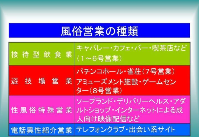 而风俗店之所以还能大行其道,又和另一部法律有关,这部法律名字很长,叫做《風俗営業等の規制及び業務の適正化等に関する法律》,也就是《风营法》。其实也不怎么需要翻译,顾名思义,中国网友应该也能看懂,这大概是在讲关于风俗营业的限制和相关解释的法律。