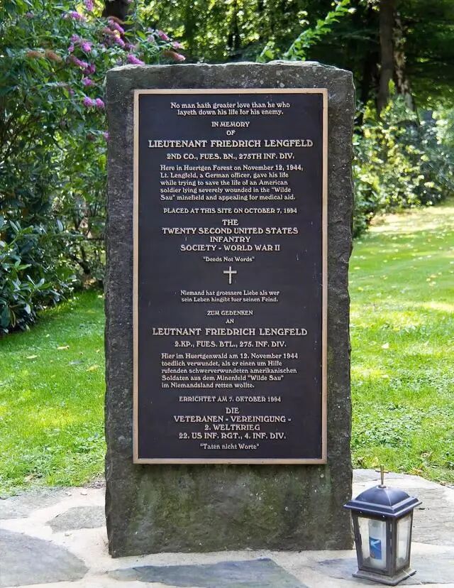 战争结束几十年后。一群美国士兵来到了许特根森林,自发为伦菲尔德悼念。他们都是当年参战的美国士兵,而这次来也为他准备了一个礼物,这是一面纪念碑,碑上刻有:“没有人会比为敌人生命而献出自己生命的人更伟大”。毕竟,人参加战争,是为国为己而战,但即使战争残忍无情,却永远无法扼杀人本就具有的人性光辉!