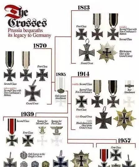 1914年8月,第一次世界大战。法德再度迸发和平。1914年8月5日,铁十字勋章规复设立。它的设想相同于1870 版, 不外日期从1870 改变成1914。以后一战和二战的故事想必许多军武的粉丝都十分理解拉。这里就放上一张铁十字的族谱把。