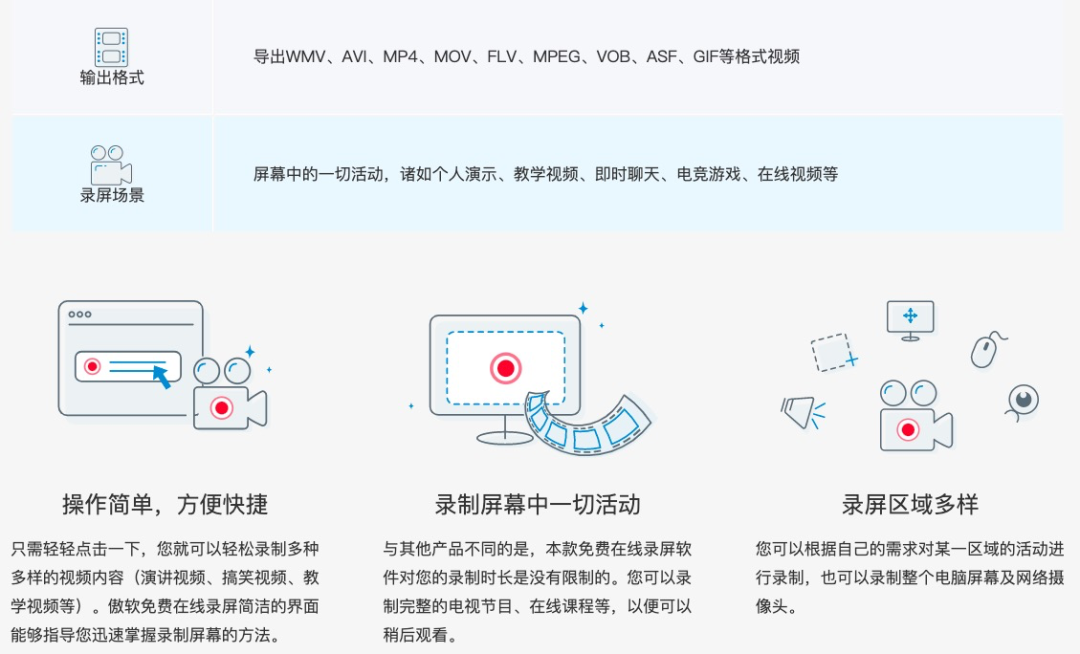 优点:支持Windows和Mac ,在线免费使用,可调节录制范围、多种视频导出格式、录制的过程中可编辑。