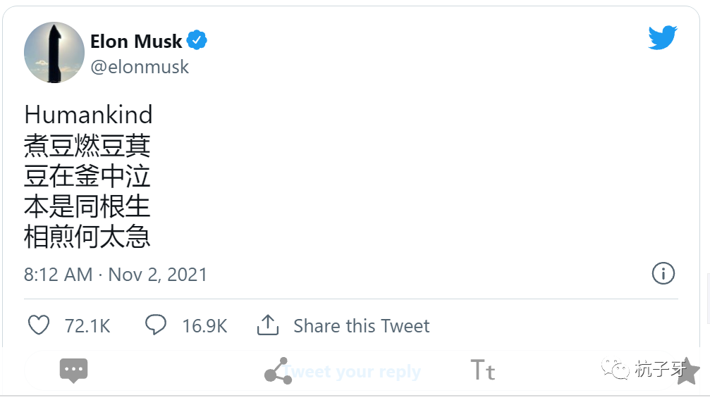 特斯拉公司(Tesla)首席执行官马斯克(Elon Musk)11月1日用中文发布一则推特(Twitter),内容是中国三国时期文学家曹植的《七步诗》。