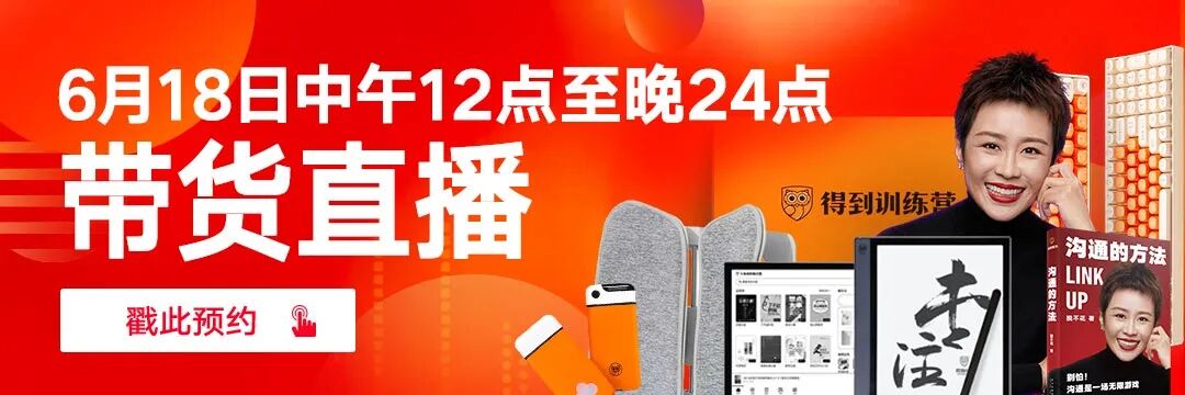 6月18日中午12点至晚24点,得到618职场开挂节,带货直播等你来!直播间每半小时都有惊喜,课程满200减30,还有1元清空课程购物车的机会,总之,优惠多多,赶紧预约吧!