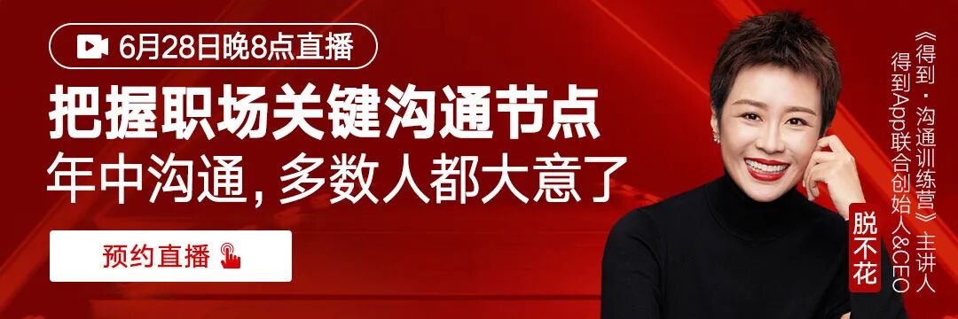 今晚8点,得到App直播间,脱不花的沟通公开课来了!半年工作汇报怎么赢得领导认可?薪酬调整怎么谈?还有3个重大的沟通加分项要在半年时发起,你知道是什么吗?赶紧预约直播,今晚干货满满,还有惊喜福利!