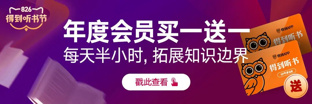 得到听书史上优惠力度最大的活动来了!8月2日~8月26日,得到听书年度会员,买一年送一年!多买多送!平均每天只需要5毛钱,就能无限次畅听将近2700本听书了!