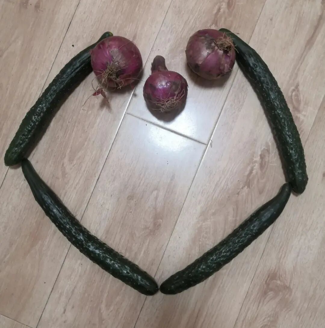蔬菜包里有:几颗洋葱,四根黄瓜,一个圆茄子,一颗卷心菜。