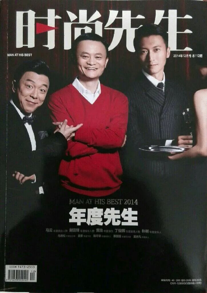 2014年底,马云再次出现在《时尚先生》的封面上,与黄渤等跨界明星一起,当选《时尚先生》十大年度人物之一。这一年,阿里巴巴在香港上市,是至关重要的节点。在这张跨界合影中,马云的表情显然比上一年松弛了很多。