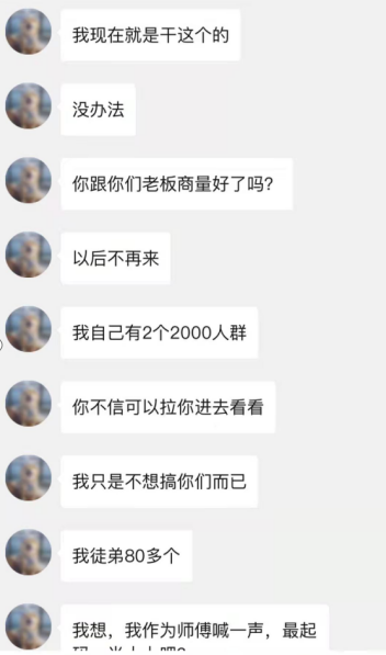 在一位拼多多商户提供的聊天记录中,一个买家直接在聊天中威胁商家称,“我有2个2000人的群,专门白嫖商家,你和你们老板商量好了说一声,我目前不想搞你们,不然我会让我群里人疯狂白嫖你们商铺”。