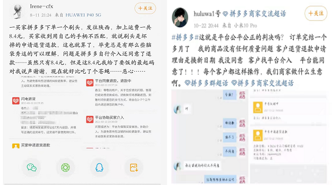 在微博“拼多多商家超话”中,huluwa等用户在吐槽拼多多的秒退款问题。