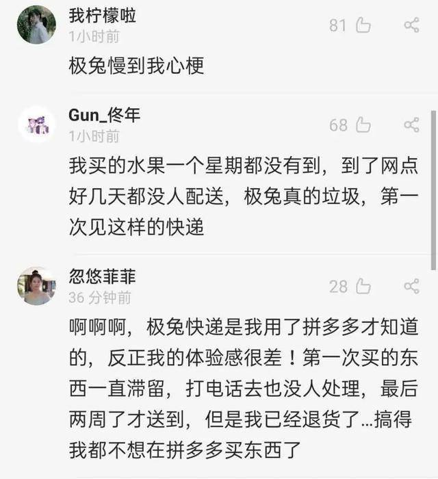 微博用户GUN在留言中这样描述极兔的慢,“我买的水果一个星期都没有到,到了网点好几天都没人配送,极兔真的垃圾,第一次见到这样的快递”。