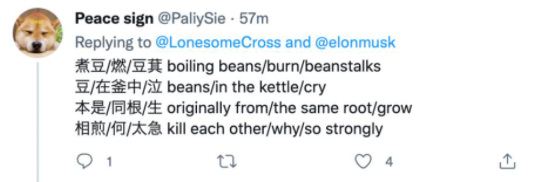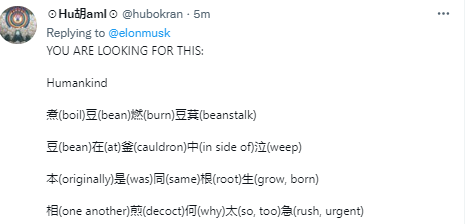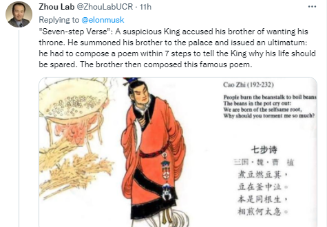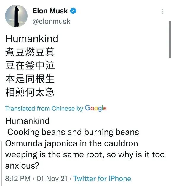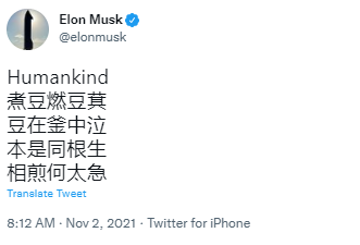 而让推特充满浓烈中小学语文课堂气息的,则是特斯拉创始人、目前的世界首富,同时也是资深游戏玩家的埃隆·马斯克。上周,他在自己的推特上吟了一首中文古诗,大多数国人都倒背如流的《七步诗》。
