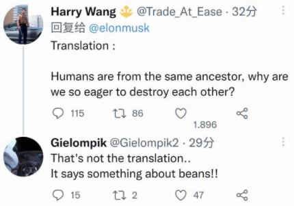 当然有人看不下去了,结合前面马斯克写着的Humankind(人类),给出了一段没有缓冲简单粗暴的翻译:人类都来自同一个祖先,为什么要自相残杀呢?