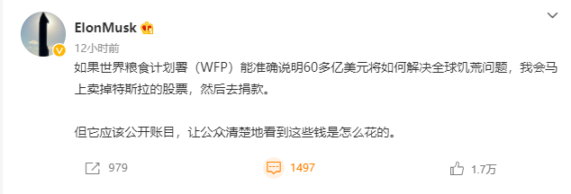 最近马斯克还被要求捐赠60亿美元来解决全球饥荒问题:联合国粮食计划署的干事称只要马斯克能捐出2%的个人资产,世界就能远离饥荒。