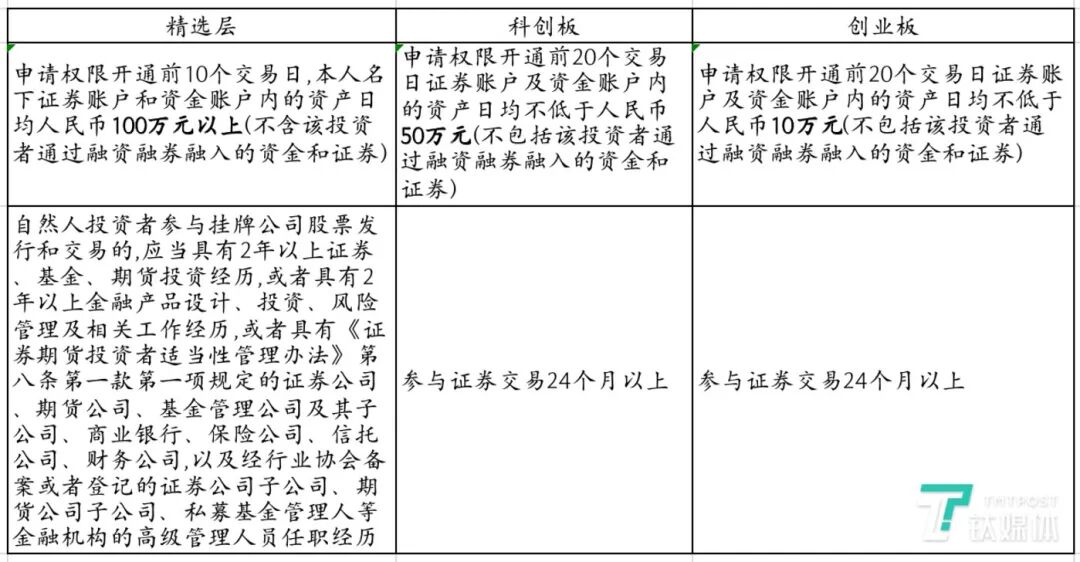 精选层、科创板、创业板的投资者开户门槛比较;制图:钛媒体