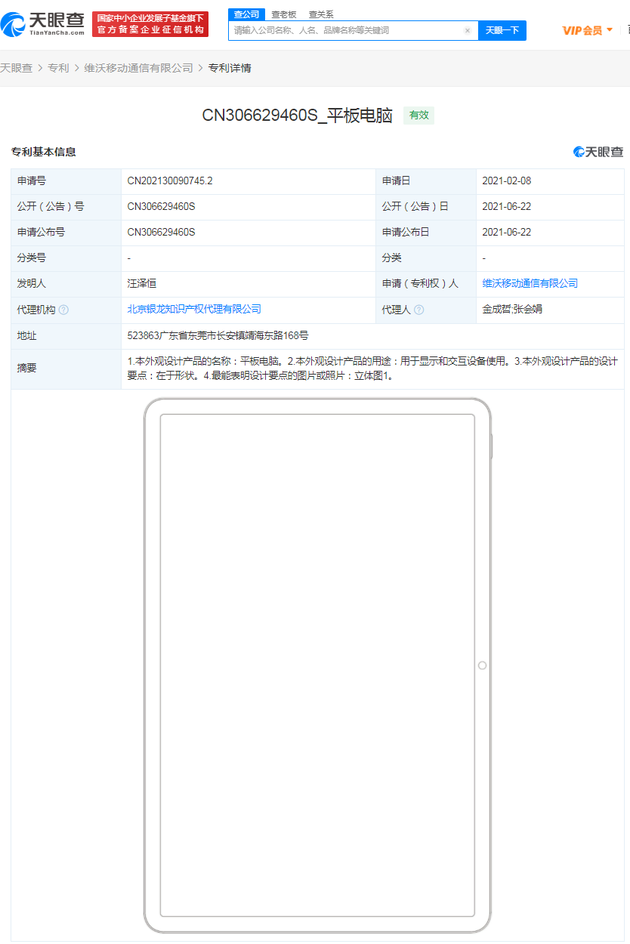 近日,vivo关联公司维沃移动通信有限公司获得两项“平板电脑”外观专利授权,公告号分别为CN306561596S、CN306629460S,申请日期为2020年12月和2021年2月。