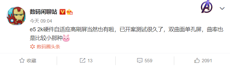 今天,有数码博主表示,小米新手机将搭载 E5 2K 硬件自适应高刷屏,已开案测试很久,双曲面单孔屏,而且曲率比较小。