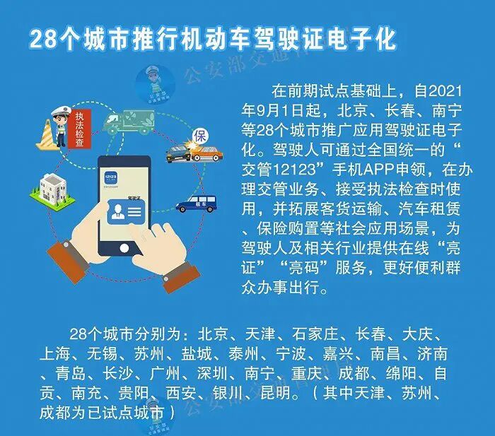 据了解,北京等 28 个城市将推行机动车驾驶证电子化。在前期试点基础上,北京、长春、南宁等 28 个城市推广应用机动车驾驶证电子化。此后,将陆续在全国范围内分阶段实施。(来源:IT之家)