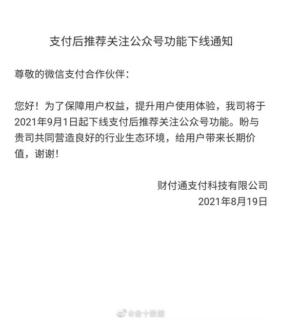 通知指出,为了保障用户权益,提升用户使用体验,公司将于 2021 年 9 月 1 日起下线支付后推荐关注公众号功能。(来源:新浪科技)