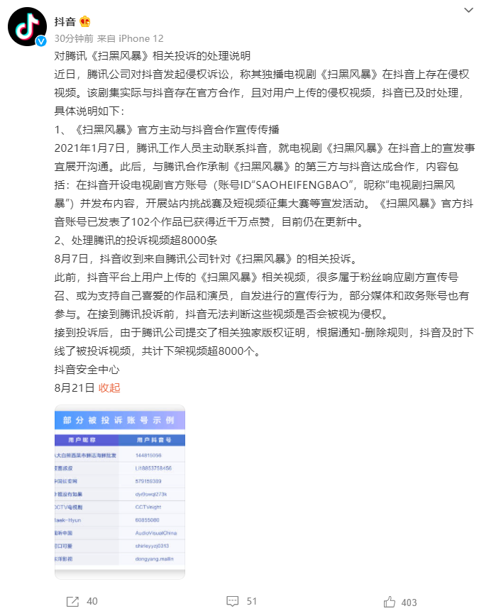 声明称,2021 年 1 月 7 日,腾讯工作人员主动联系抖音,就电视剧《扫黑风暴》在抖音上的宣发事宜展开沟通。接到投诉后,由于腾讯公司提交了相关独家版权证明,根据通知-删除规则,抖音及时下线了被投诉视频,共计下架视频超 8000 个。