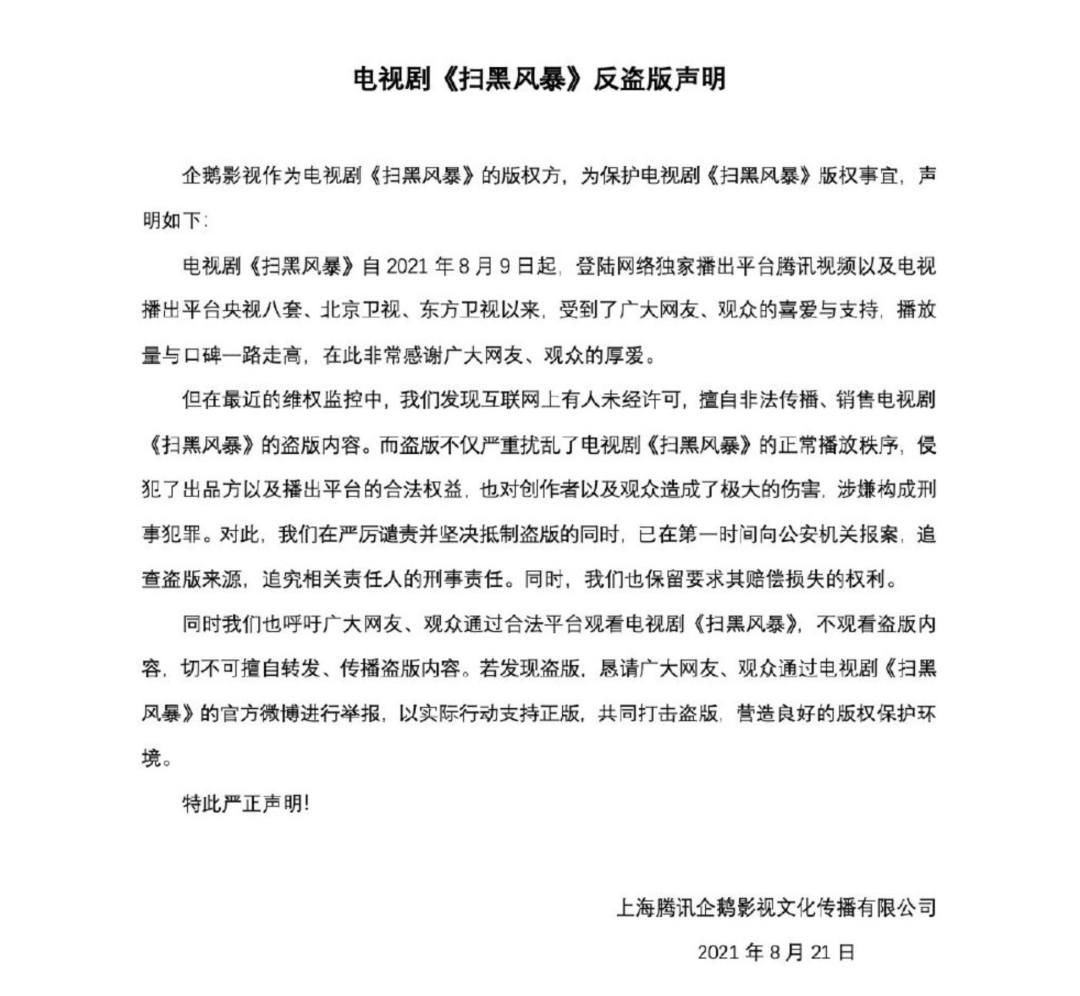 其表示,近期互联网上有人未经许可,擅自非法传播、销售电视剧《扫黑风暴》的盗版内容。在严厉谴责并坚决抵制盗版的同时,已在第一时间向公安机关报案追查盗版来源,追究相关责任人的刑事责任。同时,也保留要求其赔偿损失的权利。(来源: IT之家)