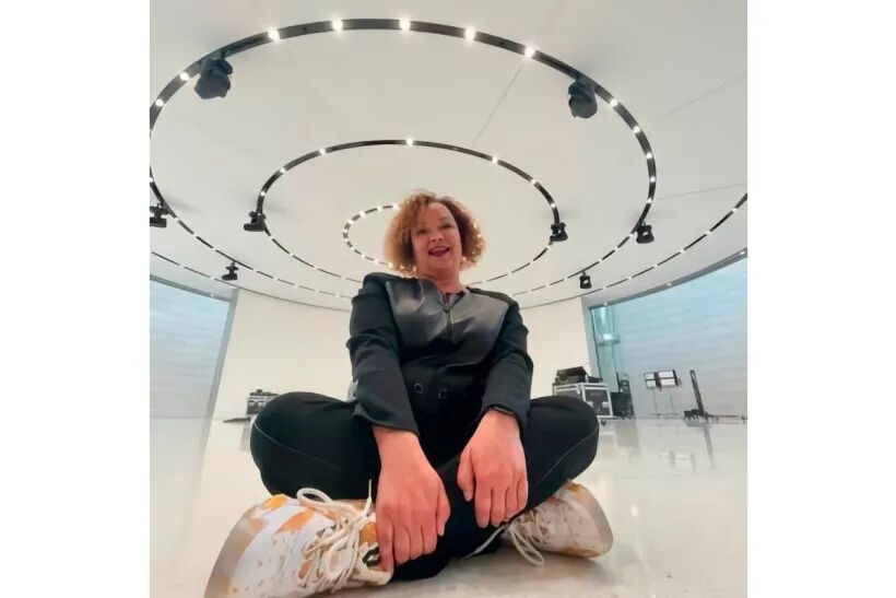 这张图片的背景一般出现在苹果特别活动的介绍环节中,包括一个天花板是同心圆的圆形房间。白色空间内有许多带轮子的箱子,通常是用于摆放广播或音乐会设备,旁边是灯光和其他装置。