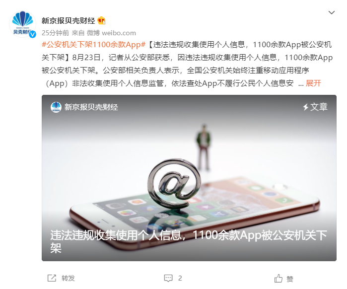 据报道,有关部门对移动应用程序非法收集使用个人信息监管,依法查处 App 不履行公民个人信息安全保护义务行为,目前已经累计下架违法违规收集使用个人信息 App 1100 余款。