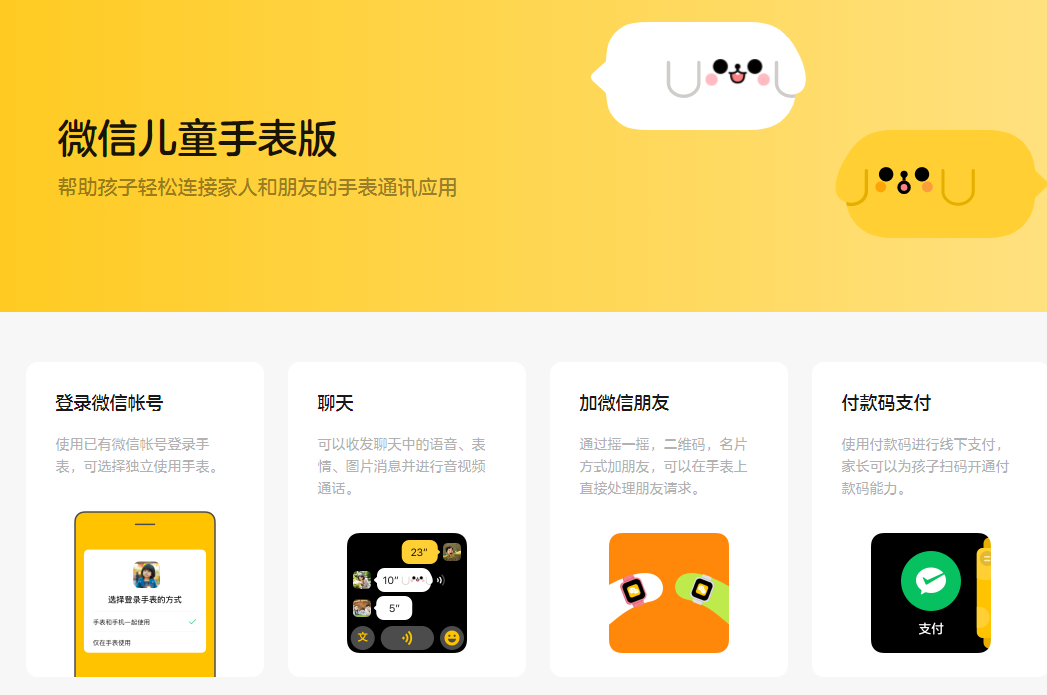 据微信官方介绍,针对儿童手表设备,微信提供了针对儿童用户使用的手表客户端。用户可以在设备登录微信帐号,实现在手表上与家人朋友聊天,加朋友以及使用付款码支付等。